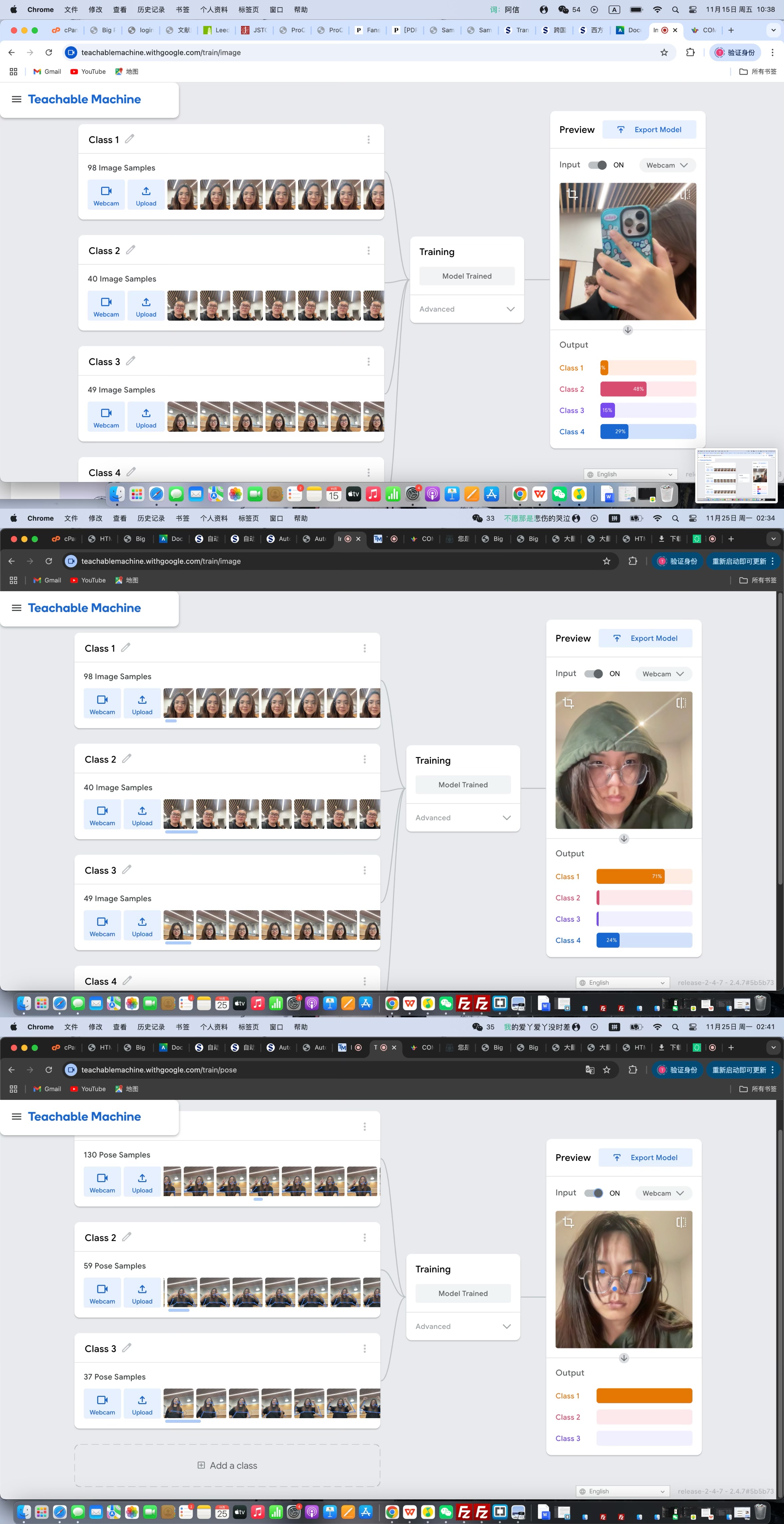 In the workshop, our group experimented with Teachable Machine. During this process, I noticed that while training and testing models were straightforward, the results often reflected data limitations and inherent biases. For example, in the image project, I uploaded photos of four group members for the model to learn. However, I found that it frequently produced errors. For instance, when I wore a hat, the system showed a 20% probability that I belonged to Model 4 (even though I was Model 1). Similarly, when I covered my face with my hair or blocked it with a phone, the system often indicated a higher probability of me being Model 2. In the pose project, I uploaded three poses: a heart shape with hands, a "V" hand gesture, and a thumbs-up gesture. However, I noticed that even when I only showed my head without any pose, the system still identified me as performing Pose 1. The system primarily detects points and lines in the image and compares them to those in the uploaded models. As a result, this process led to frequent errors and biases.