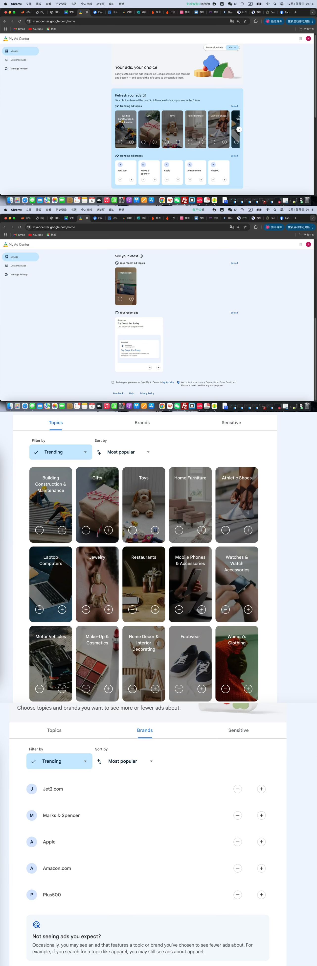 In Task 2 of the course, I examined Google’s Ad Center. Google categorizes users based on their online behavior into various topics and brands. For example, ad topics include gifts, toys, home furniture, athletic shoes, and more specific sensitive categories like alcohol, gambling, and pregnancy. The brand categories, such as "Jet2.com," "Marks & Spencer," and "Apple," are likely based on my previous searches. Interestingly, I was recommended a DeepL translation ad, probably because I frequently use this translation tool. However, the ad for Jet2.com surprised me, as I only searched for it once and never booked flights on the site. This made me question how certain ads are prioritized in my profile.