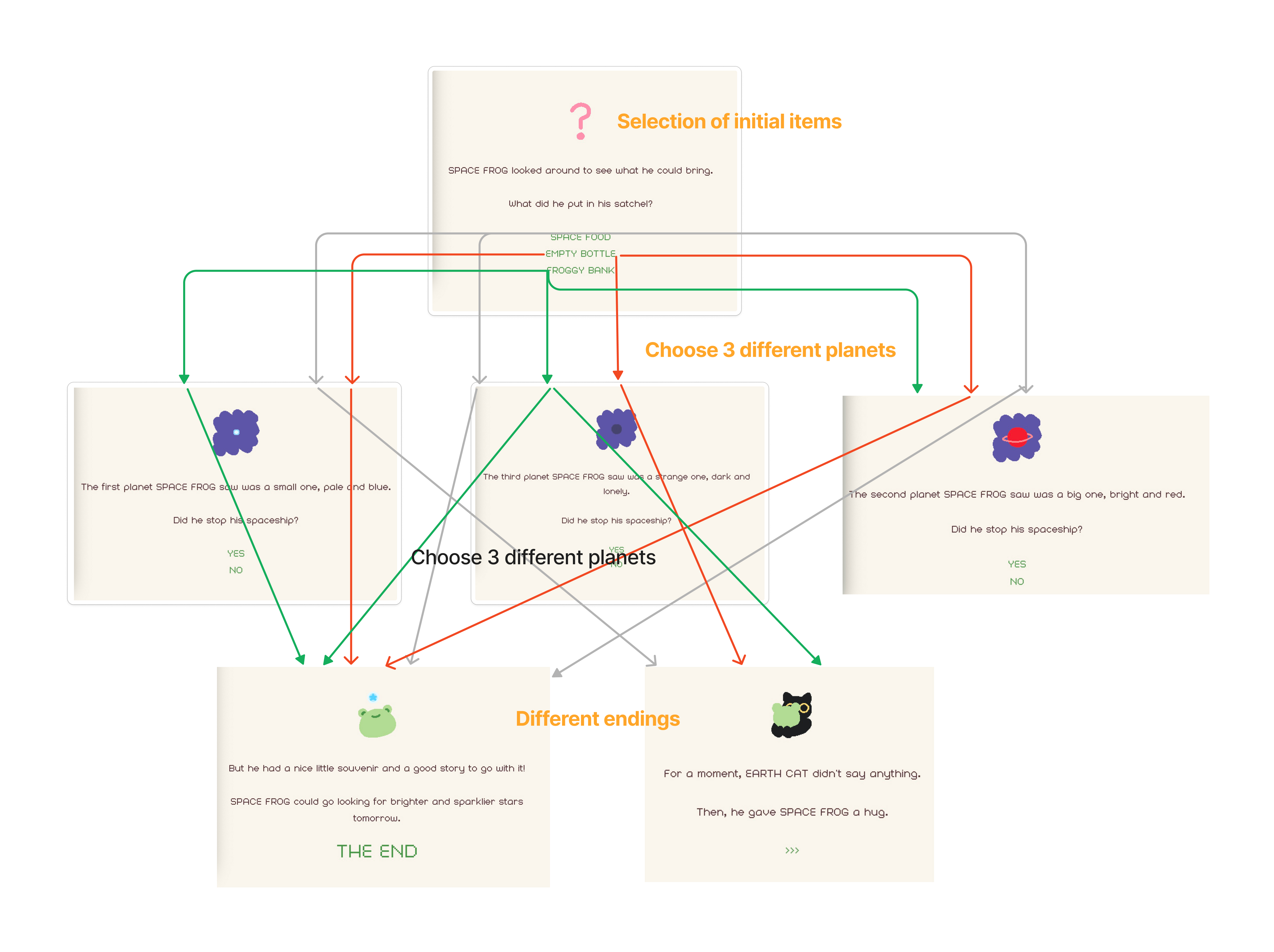 Space Frog is an interactive game in which your decisions shape the story. Players must select basic things (such as empty bottles or space food) and explore worlds of various colors (blue, red, or black). The game has a number of alternative endings, including obtaining enormous shiny stars, just getting small stars, or even returning empty-handed. This design made me realize the importance of choice in narrative and demonstrated the flexibility of branching paths; Aarseth's theory of 'cybertext' states that the core of interactive narratives is the user's choice to shape the dynamic text, whereas 'ergodic literature' refers to the user's choice to shape the dynamic text. Literature highlights the importance of users making an effort to understand and explore the story. In Frogs in Space, players try out numerous combinations of objects and planets to find the best path, a trial-and-error process that not only adds to the fun of exploration, but also boosts the player's sense of initiative and participation in the story. 'Frogs in Space' also makes me think of Borges' concept of the "garden of divergent paths," in which time is not linear but full of branching possibilities. The game's multi-path narrative allows the player to sense the unlimited possibilities of choice and create a unique storytelling experience by branching off into multiple routes.
