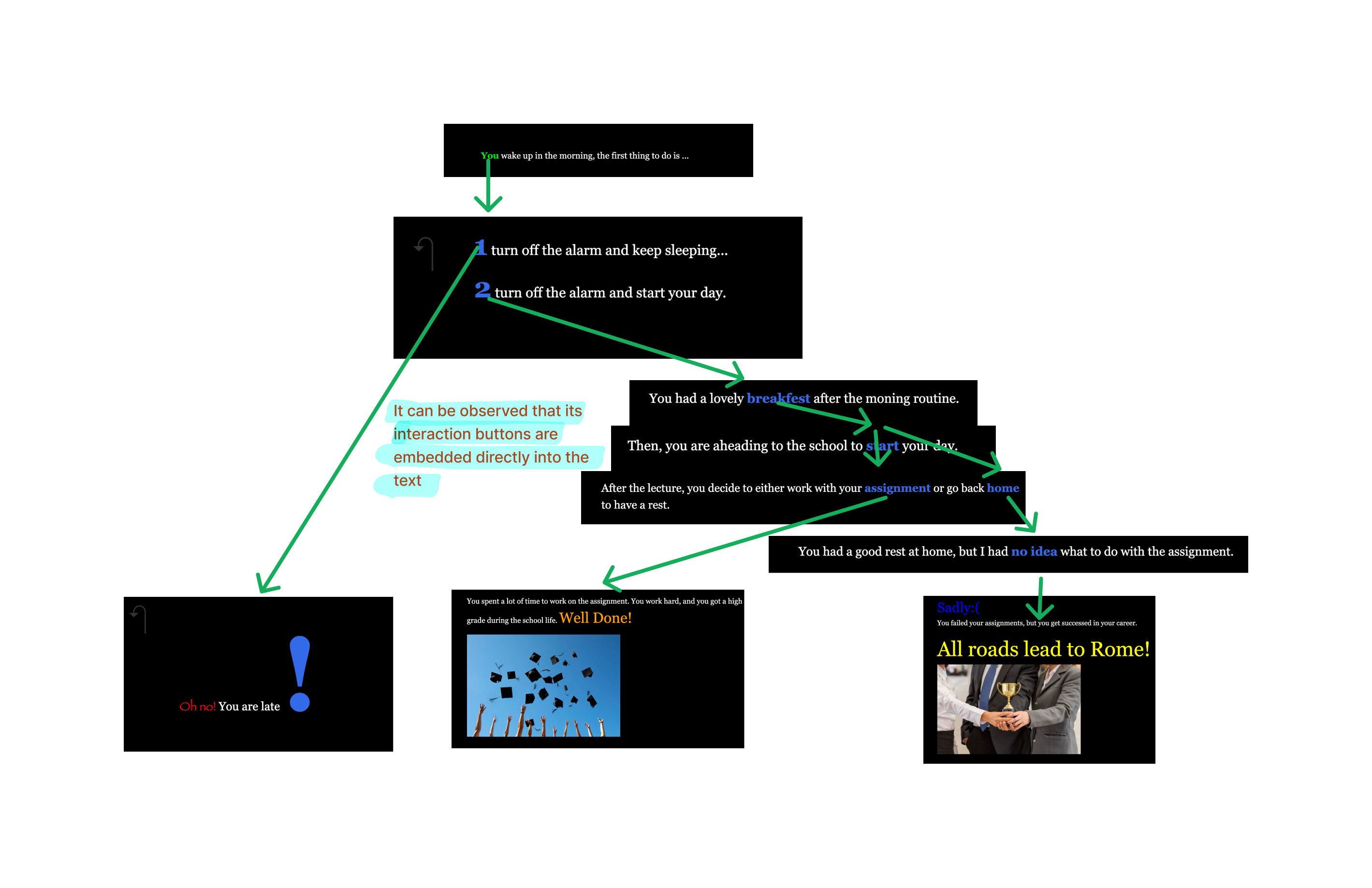 A group member utilized Twine to create a game based on college students' daily study tasks. For example, in the game, players can graduate by rigorously completing their duties, whereas a lax approach can lead to failure. The nicest design feature of the game, in my opinion, is that she included clickable buttons in the text, which I believe improves the player's immersion while reading.〈br/>