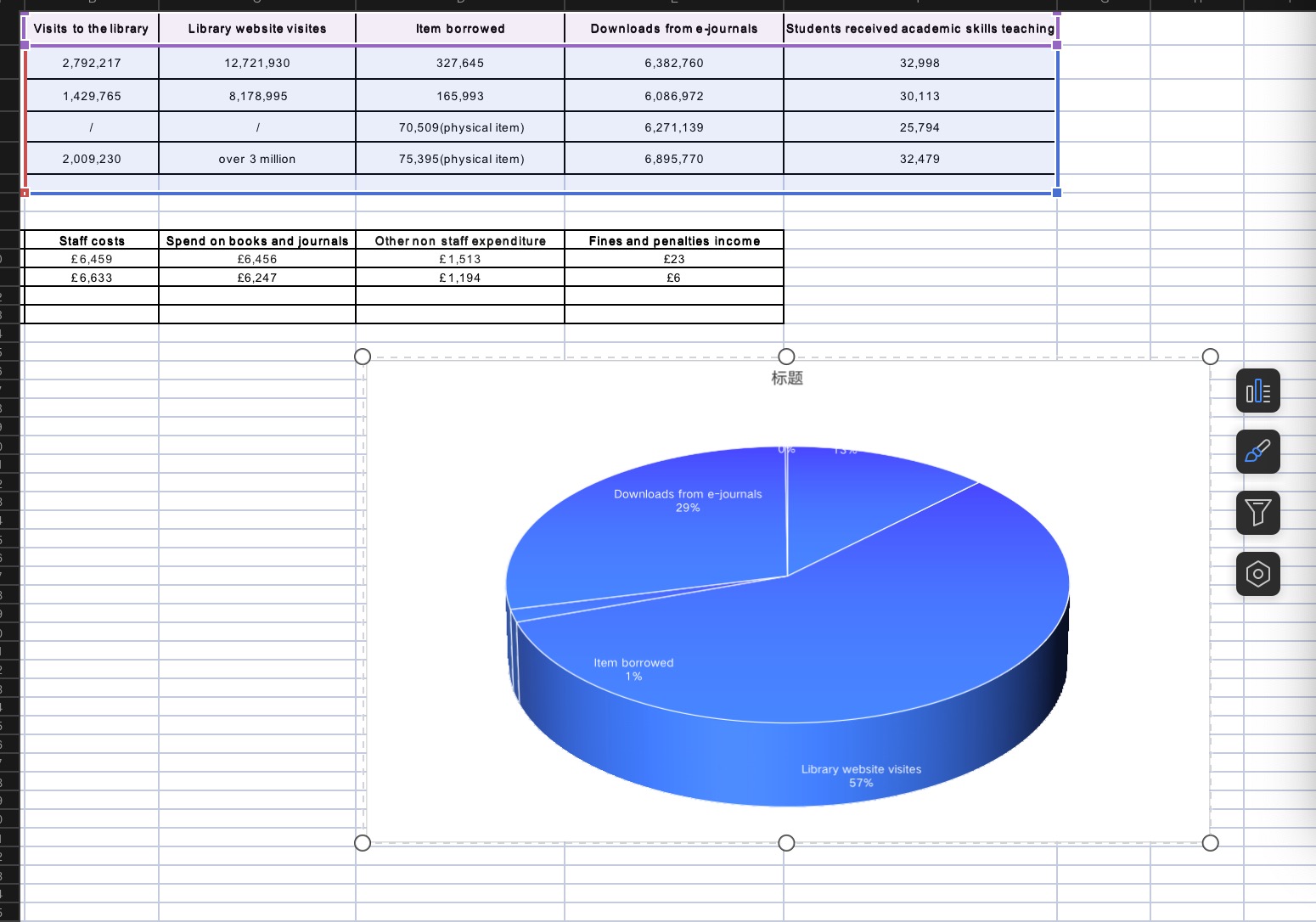 In the fifth week of our course, we learned how to present collected data through visualization to better interpret patterns and relationships within the data. Based on the data collected in Week 4 about the University of Leeds library’s resource usage, our group used Excel to create a pie chart, visualizing the data from the table. The pie chart clearly illustrates the proportions of resource usage. For example, library website visits accounted for the largest share at 57%, followed by e-journal downloads at 29%, while physical book loans accounted for only 1%. This highlights students' strong reliance on digital resources.