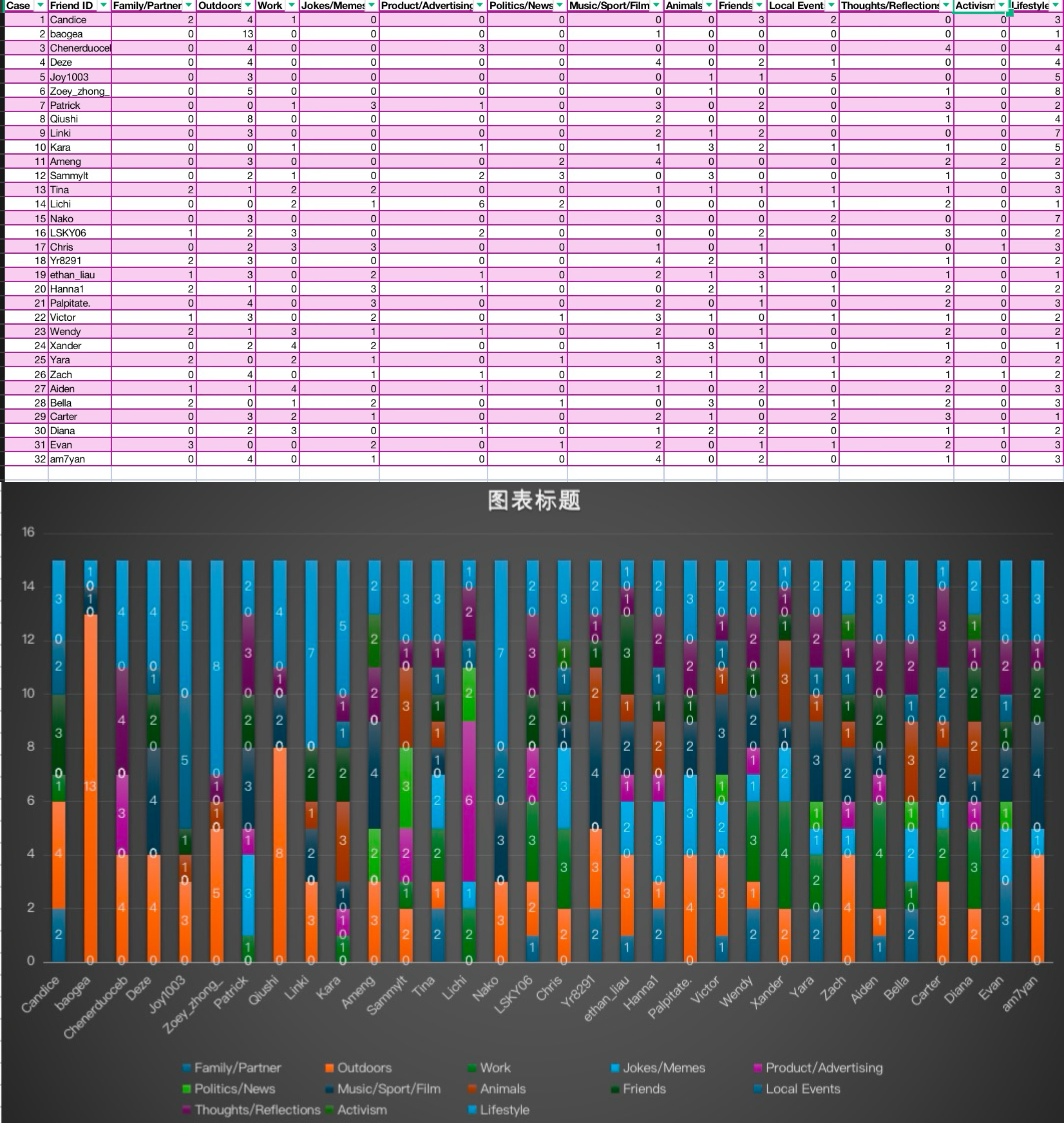 In the ninth week's workshop, we conducted group discussions by practicing Sumpter's method. Our group recorded the social media content of 32 friends and categorized it using Sumpter's framework. During this process, we found that many posts were difficult to categorize clearly, which revealed the limitations of this method. For example, some friends posted photos of gatherings that included outdoor scenes, family, and friends, making it challenging to classify them strictly into categories like “outdoors,” “friends,” or “family.” Additionally, we noticed an interesting phenomenon: the content shared by our friends often focused more on their personal lives and interests, with fewer posts about their family or friends. Surprisingly, posts related to animals appeared more frequently than those about friends or family. These findings led us to reflect on the content preferences on social media and highlighted the need for further refinement and segmentation of Sumpter's framework.